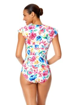 Women’s Riviera Floral Flutter Sleeve Zip Up Rash Guard One Piece Swimsuit(Womens Riviera Floral Flutter Sleeve Zip Up Rash Guard One Piece Swimsuit)